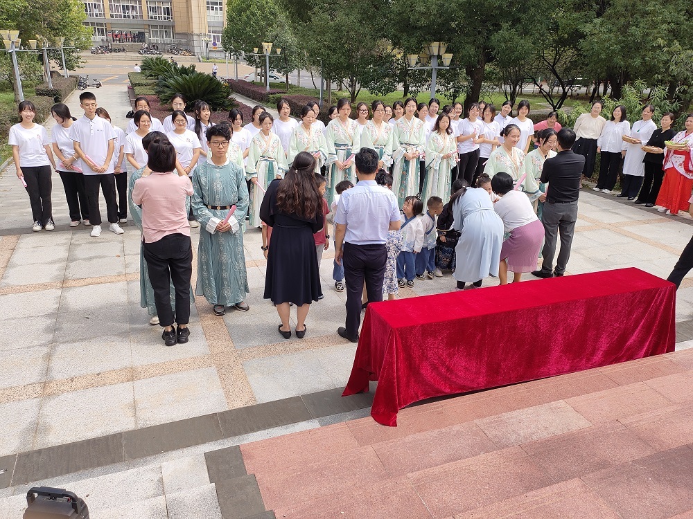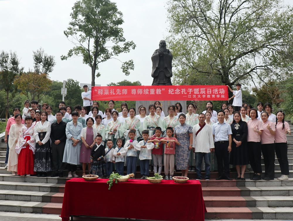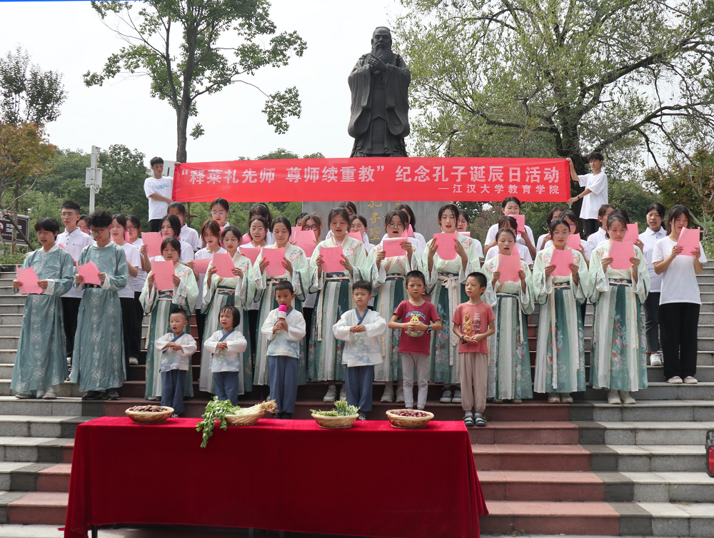 9月28日是孔子诞辰2574周年纪念日,为传承弘扬中华优秀传统文化,赓续尊师重教的优良传统,江汉大学教育学院与武汉育乐园近50余名师生一道在学校未名山孔子像前一同举办“释菜礼先师,尊师续重教”孔子诞辰日纪念活动,以文化自信献礼国庆。