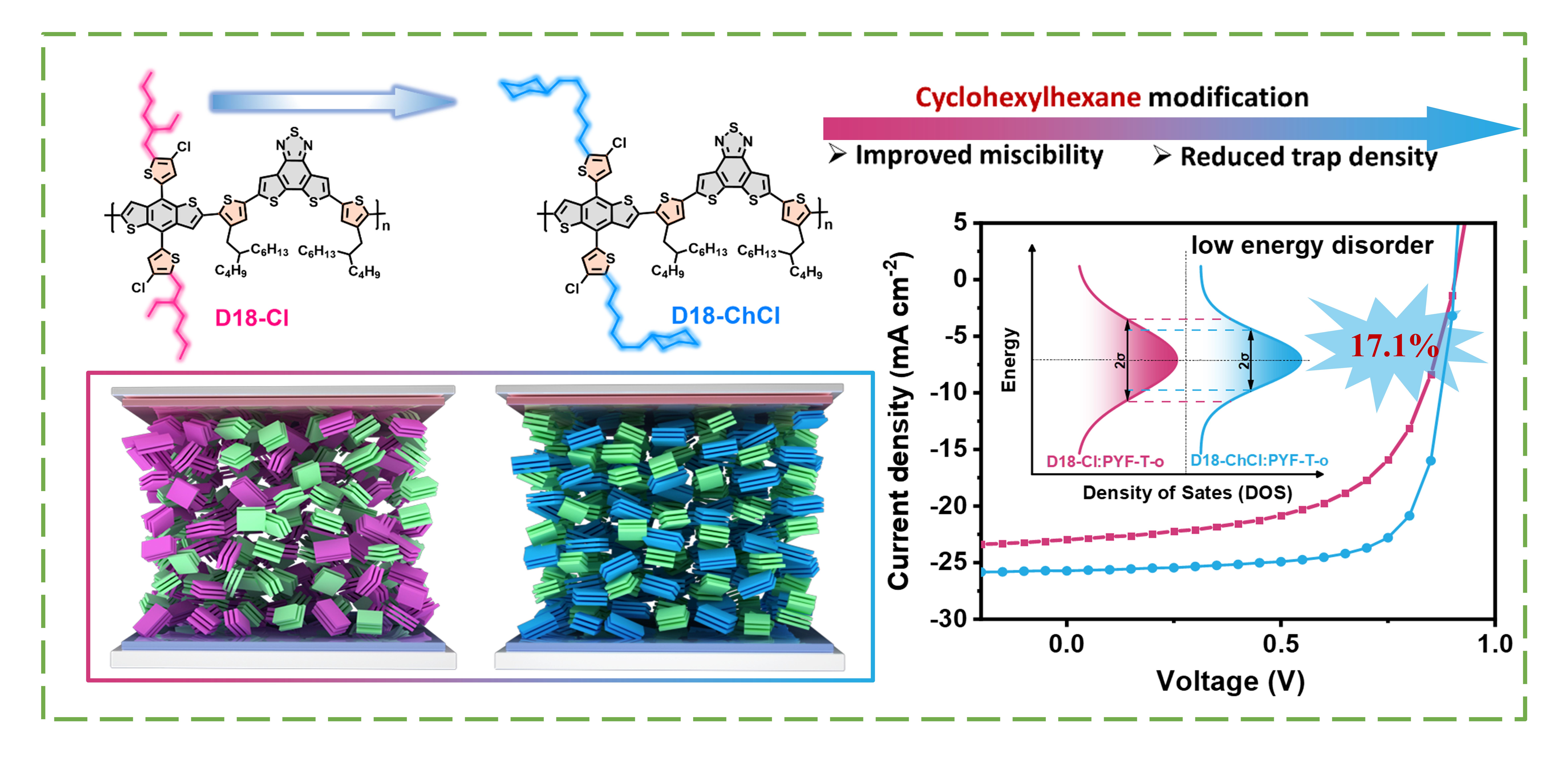 该项研究通过在聚合物光伏材料的侧链中用环状己基-线性己基混合侧链取代乙基己基,结果表明同时提高了器件中给受体两相的混溶性和共混薄膜中的有序堆积,显著降低了陷阱密度(图2)。这种形态演变会对电池的性能产生重要影响——延长载流子寿命、促进激子解离并降低能量无序度,最终大幅提高了电池的效率和稳定性。本研究提出的杂化侧链策略为聚合物太阳能电池研究领域带来了新的活力。