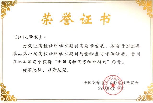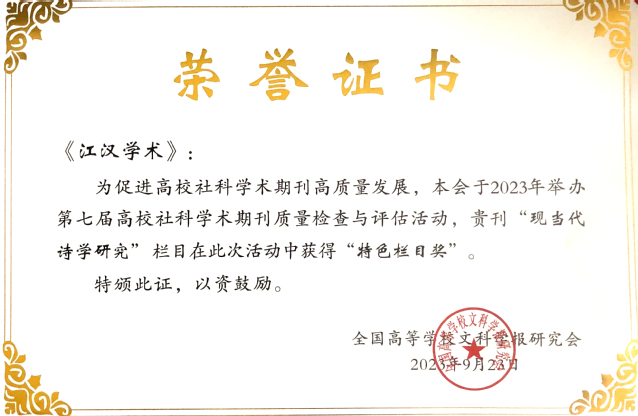 9月22至25 日,全国高等学校文科学报研究会九届三次理事会会议在湖北宜昌三峡大学举行,会上公布了第七届全国高校社科学术期刊质量检查与评估结果,我校《江汉学术》被评为全国高校优秀社科期刊,“现当代诗学研究”栏目荣获“特色栏目奖”。