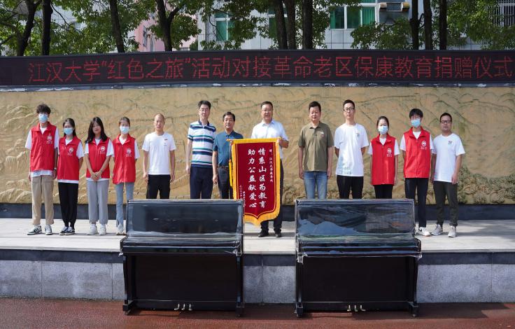 我校师生还来到保康县熊绎中学,了解学校目前面临的困难,我校教务处负责人表示将发挥江汉大学智力优势为熊绎中学做力所能及之事。我校为熊绎中学捐赠钢琴4台,篮球、足球、排球各30个,熊绎中学校长唐明星表达了对江汉大学的感谢。