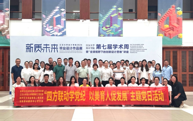 5月10日,江汉大学设计学院、金荷社区、经开区市场监督管理局、沌阳劳动服务中心等四个单位60余名党员在设计学院参加了“党建+美育”联合主题党日活动。活动以“讲党课”“学党纪”“观展览”等多种形式开展,充分发挥高校美育资源与优势,以美育人,引领党员在沉浸式体验中感受美的熏陶,提升审美修养和人文素养,把美育多维度全方位融入校社、校政共建中。