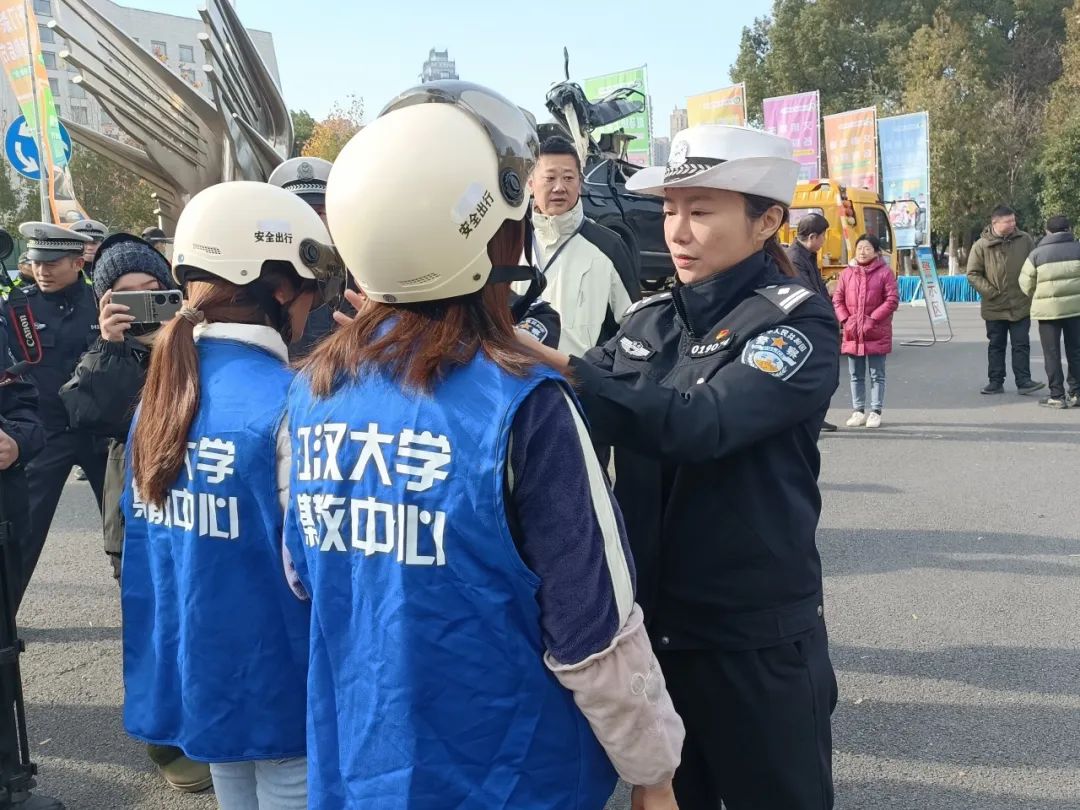 更有交通警察在校内道路模拟执法,检测酒驾,查纠驾驶机动车不系安全带等违规骑行行为,现场赠送电动自行车安全头盔。
