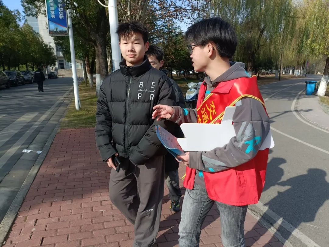 12月22日,我校南区人头攒动,志愿者身着红马甲散发交通安全小知识宣传单,保卫处工作人员穿行在人群中进行交通事故车辆警示教育。