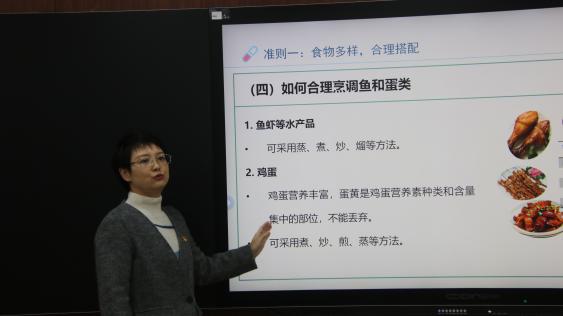 食品科学系王璐老师在讲座中结合生活常识,用通俗易懂、风趣幽默的话语讲解了《中国居民膳食指南》的八大原则,即:食物多样,合理搭配;吃动平衡,健康体重;多吃蔬果奶类全谷大豆;适量吃鱼、禽、蛋、瘦肉;少盐少油,控糖限酒;规律进餐,足量饮水;会烹会选,会看标签;公筷分餐,杜绝浪费。积极引导大家要关注饮食健康,合理的膳食搭配才是身体健康的基础。