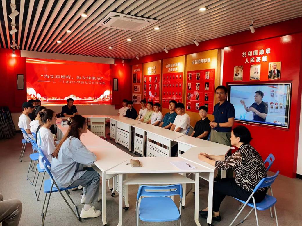 为庆祝中国共产党成立102周年,弘扬革命精神,赓续红色血脉,汲取奋进力量,推动学习贯彻党的二十大精神和习近平新时代中国特色社会主义思想主题教育,6月30日,体育学院开展“七一”主题教育暨新党员入党宣誓仪式。学院党委书记张琮玫、副书记黄松,优秀党员代表章建波老师、全体辅导员、新入党同学参加活动。