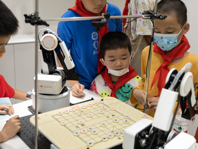 “为什么它能像人一样自由行走?”“为什么这两个机器臂能像人的手一样实现象棋对弈,还能写毛笔字?”“为什么可以将人的动作传给机器人和我玩‘石头剪刀布’?”孩子们对各类机器人和大学生创意作品充满好奇,在互动过程中一连串发问,大学生志愿者们用通俗易懂的语言耐心解释机器运行的原理。