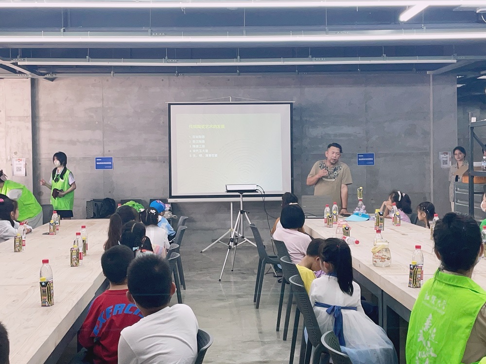 陶艺活动从了解中国陶瓷文化入手,杨巍老师介绍了中国陶瓷文化的起源、发展历史以及陶艺作品的前期准备、中期创作、后期烧制的基础知识,在小朋友们对陶瓷艺术有了初步的了解后,“艺术小课堂”团队小助教们指导小朋友们开始动手实践。