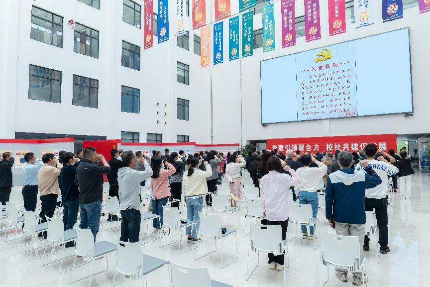 为全面贯彻落实习近平新时代中国特色社会主义思想和党的二十大精神,推动主题教育走深走实,以高质量党建引领高质量发展,5月11日上午,武汉经济技术开发区沌阳街道金域蓝湾社区和佳泰社区70余名党员代表走进江汉大学,与江汉大学机关党委、校纪委、规划与学科处、财务处、社会合作处党支部联合开展了“党建引领聚合力 校社共建促发展”党建共建活动。社会合作与校友工作处处长吴菊珍主持活动。