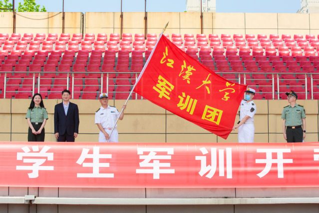 张红星向学生军训团团长余荣华授旗。余荣华在军训动员讲话中,希望全体参训教官和教师共同努力,在常态化疫情防控要求下,出色完成好2021级学生军训任务。
