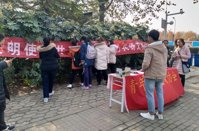 校青协组织师生们在宣传横幅上签名,同时开展竞答共享单车停放点,号召大家文明停车,共同建设美好校园。(校团委)