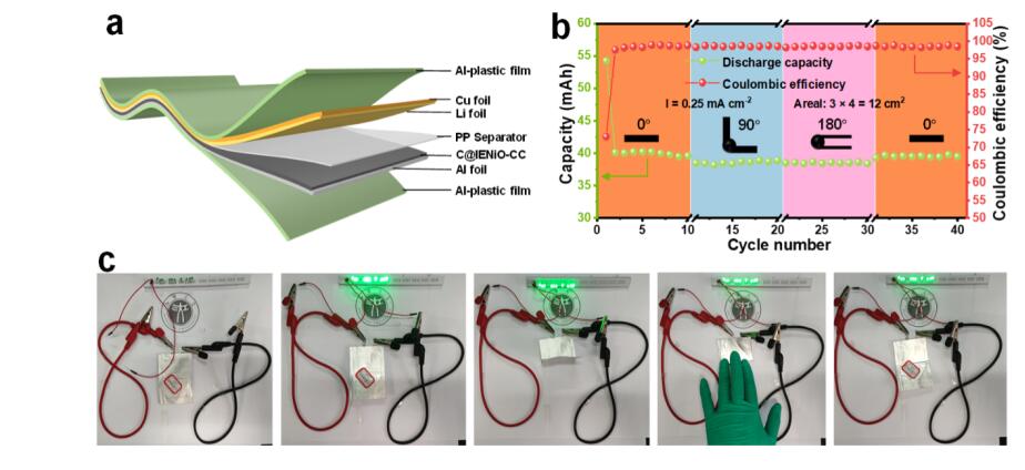 随着柔性可穿戴器件的快速发展,要实现全柔性的集成系统,柔性供能系统的开发显得尤为迫切。锂离子电池(LIB)由于其高能量密度、高功率密度以及长的循环寿命成为理想的选择。传统的锂离子电池将活性材料附着在金属集流体上,难以在弯曲或扭曲变形情况下保持电池的性能。某些情况下,从电极上剥离的活性材料甚至能穿透隔膜,造成短路和安全隐患。此外,一层一层卷曲的结构使LIB体积过大无法满足全柔性系统,因此开发具有良好柔性、机械稳定性和电化学性能的柔性锂离子电池非常重要。梁济元课题组借助离子交换方法,在柔性碳布表面构造出具有高稳定性的碳包覆氧化镍电极材料,较传统的用有机物包覆并高温退火实现的碳包覆工艺,这种逆向包覆-转化策略(首先进行碳包覆,其次进行IE和脱水处理转变成目标产物),同时实现了避免过渡金属氧化物发生碳热还原及高温退火过程中使得碳材料具有优异石墨化程度,从而确保了具有高导电性的有效碳包覆层。在4 mg cm-2的高载量、0.25 mA cm-2的电流密度条件下,C@IENiO-CC具有3.08 mAh cm-2的高面积比容量;在0.5 mA cm-2的电流密度下,稳定循环300圈后,面容量维持在2.5 mAh cm-2;即使在8 mA cm-2的大电流密度下,面容量仍保持在1.78 mAh cm-2。此外,基于C@IENiO-CC自支撑电极制作成的单层软包电池在任何弯曲或折叠条件下,可以稳定地赋予电子设备能量,进一步揭示了这种策略构造柔性电极的的实用性。因此,这种IE辅助的碳包覆策略具有很强的应用前景、可扩展性和实用性。