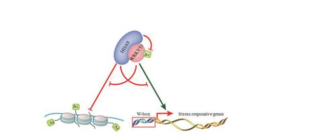 染色质修饰是表观遗传调控的重要方式之一,包括DNA甲基化、组蛋白修饰、核小体定位等,染色质修饰在生物体内高度保守且对于生物的生长发育至关重要。在各种染色质修饰中,组蛋白乙酰化修饰是植物适应环境胁迫的一种重要的表观调控手段。拟南芥是研究中的模式植物,通过对拟南芥的研究并将其应用到作物中是缩短研究年限的方法之一。已有报道发现拟南芥RPD3去乙酰化酶家族的一员HDA9可以抑制植物应答胁迫。但是,HDA9这个表观调控因子具体作用于哪个靶位点,进而控制植物适应胁迫的基因表达网络仍然未知。该研究发现HDA9的去乙酰化酶活区域可以和转录因子WRKY53的DNA-bingding区域相结合,进而影响WRKY53的转录激活能力。此外WRKY53蛋白上多个赖氨酸位点会发生乙酰化修饰,并且这种翻译后修饰受到HDA9的抑制,WRKY53上乙酰化修饰的减少也会影响其转录激活能力。HDA9通过抑制WRKY53这个植物胁迫应答网络重要的上游转录因子的活性从而降低植物对胁迫的耐受性。此外,该研究也发现WRKY53对HDA9的去乙酰化酶活活性也有一定的抑制作用。该研究揭示了在植物应答胁迫的网络中表观调控因子和转录因子之间是可以发生功能上的协同作用这一分子机制。