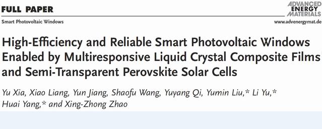 近日,交叉研究院副研究员刘钰旻及其团队指导的2016级硕士研究生夏宇,在能源领域国际权威期刊《先进能源材料》(Advanced Energy Materials, IF=24.884)上发表学术论文《基于多响应液晶薄膜和半透明钙钛矿太阳能电池的高性能智能光伏窗户》(High-Efficiency and Reliable Smart Photovoltaic Windows Enabled by Multiresponsive Liquid Crystal Composite Films and Semi-Transparent Perovskite Solar Cells)。该研究成果将多响应液晶聚合物薄膜与半透明钙钛矿太阳能电池相结合,制备出多响应模式的智能光伏窗户(SPWs)。