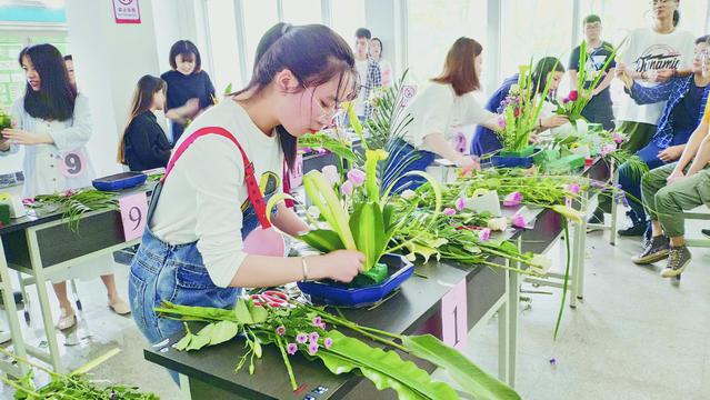 在比赛现场,16名参赛选手经过60分钟的精心设计、制作,16件姿态各异、意趣丰富的花艺作品呈现在了大家面前。专业教师组成的评审团从创意与主题、整体构图造型、色彩配置和插作技巧等方面对参赛作品进行评分。