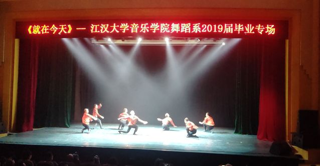 4月19日晚,音乐学院在江汉大学演播厅成功举办2019届舞蹈毕业专场《就在今天》。12名舞蹈系毕业生用他们的肢体语言讲述了属于他们的精彩大学生活,现场气氛热烈,座无虚席。湖北省舞协、武汉音乐学院专家团队及学校部门、单位领导受邀出席晚会。