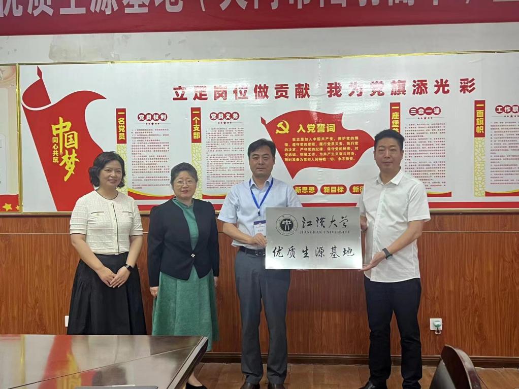 5月31日上午,江汉大学与天门市陆羽高中举行优质生源基地签约授牌仪式,并开展了访企拓岗座谈会。仪式在陆羽高中南院行政楼1楼会议室举行,天门市教育局副局长龚淑琴,陆羽高中党委书记黄浦忠、校长杜少红,江汉大学教育学院院长兰军、党委副书记李珍华和杨坚博士等参加。