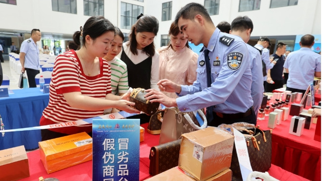 “怎样辨别假冒伪劣商品?我们可以采取‘看、摸、比’三步法:细看商标、触摸标识、对比包装。”在实物展示区,各式各样的香烟、白酒、化妆品、皮包等铺满了一张张展台,吸引了大量师生围观。民警介绍,这些都是近年来警方查扣的假冒伪劣商品,并现场讲解各类识假辨假知识。