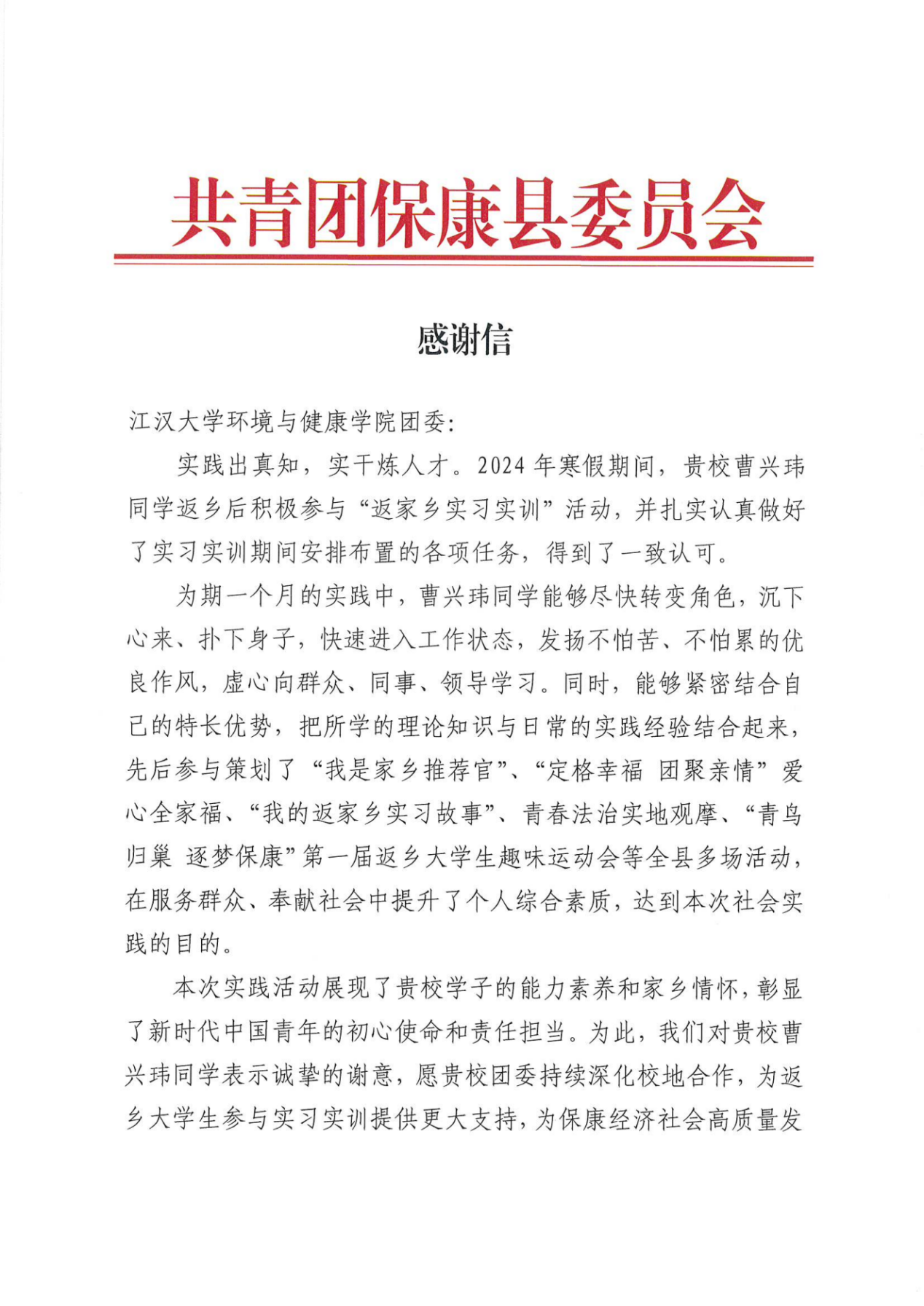 近日,环境与健康学院收到保康县团委寄来的感谢信,表扬曹兴玮同学积极投身2024年寒假大学生“返家乡”社会实践活动,结合个人特长,参与策划多场全县活动,用实际行动彰显了江大学子的时代风貌和责任担当,并对学校表示感谢。