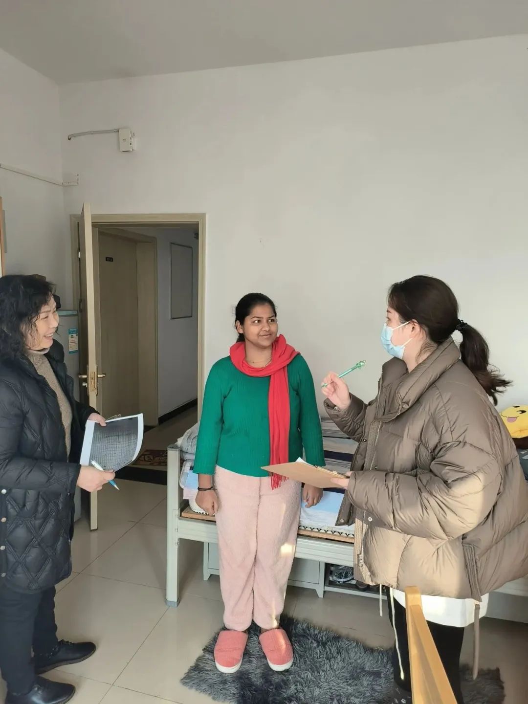 特殊时期,针对留校的外籍师生,国际处及时采取应急处置,实行每日领导带班、到岗值班、宿管24小时值守制度。由于近期天气寒冷,雨雪增多,2月7日,国际处老师先后巡查了公寓活动中心、洗衣房、公共厨房及其他公共区域,向学生们询问了日常学习与生活情况,并提醒大家注意用电安全,防止火灾等意外发生,嘱咐同学们适当增添衣服,均衡饮食,保持身体健康。