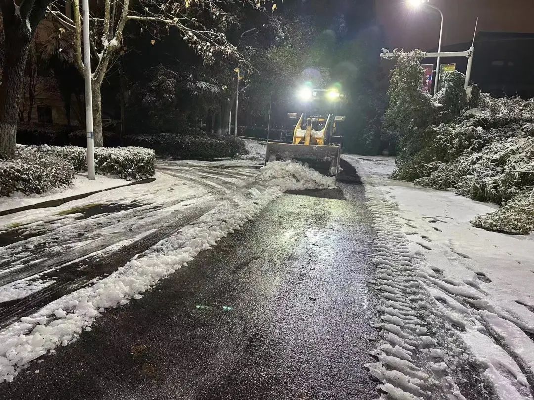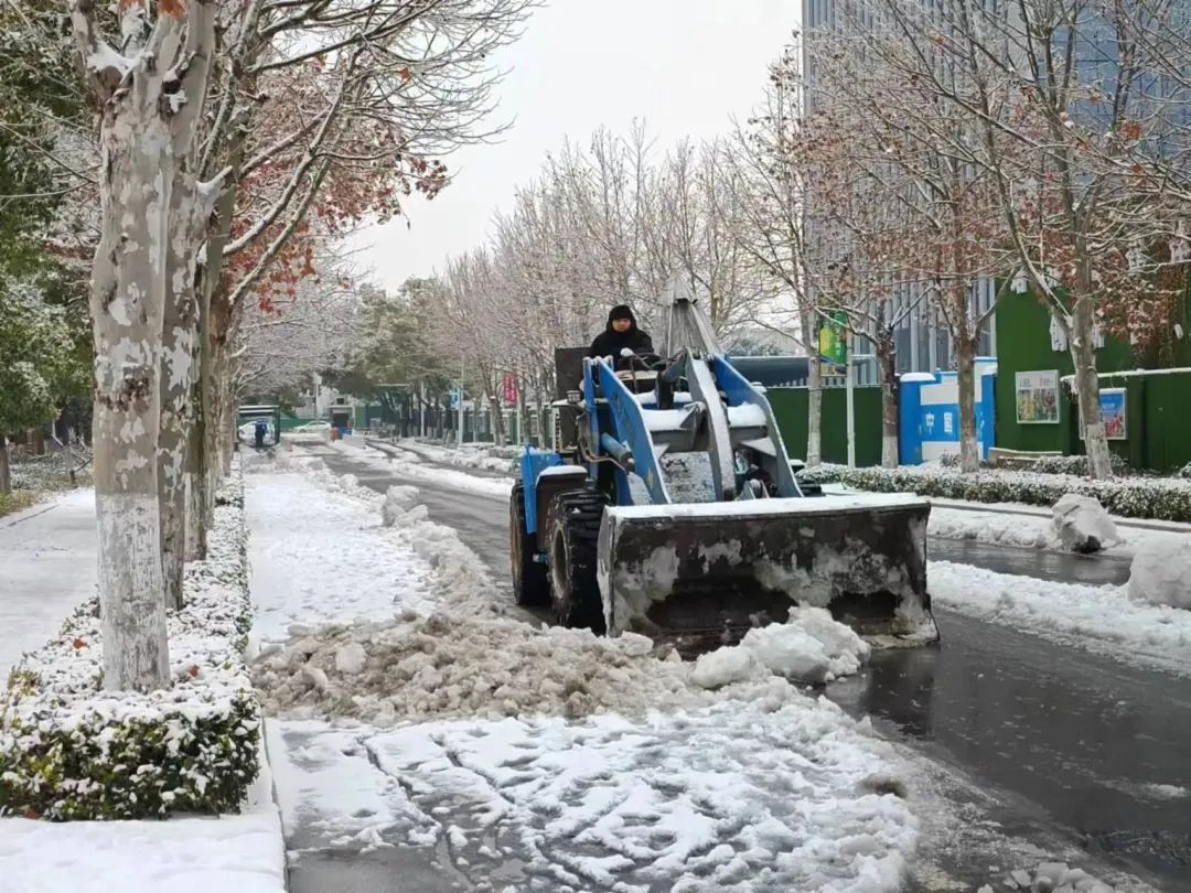 校园里随处可见忙碌的身影,为了保障工作效率,在校教职员工无论部门、无论职级,毅然操起铁锹,投入这场与风雪的“战斗”中,最终完成了校园主干道全线贯通大循环。