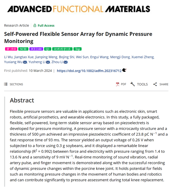 近日,我校智能体育与主动健康研究院吴钰祥教授团队在国际顶级期刊《Advanced Functional Materials》(中科院SCI一区TOP,影响因子19.0) 发表题为《Self-Powered Flexible Sensor Array for Dynamic Pressure Monitoring》的重要研究成果。我校2014级本科生、2020级硕士研究生、现中国科学院大学博士生吴礼为论文第一作者,吴钰祥教授为第一通讯作者,江汉大学为第一作者单位和第一通讯单位。