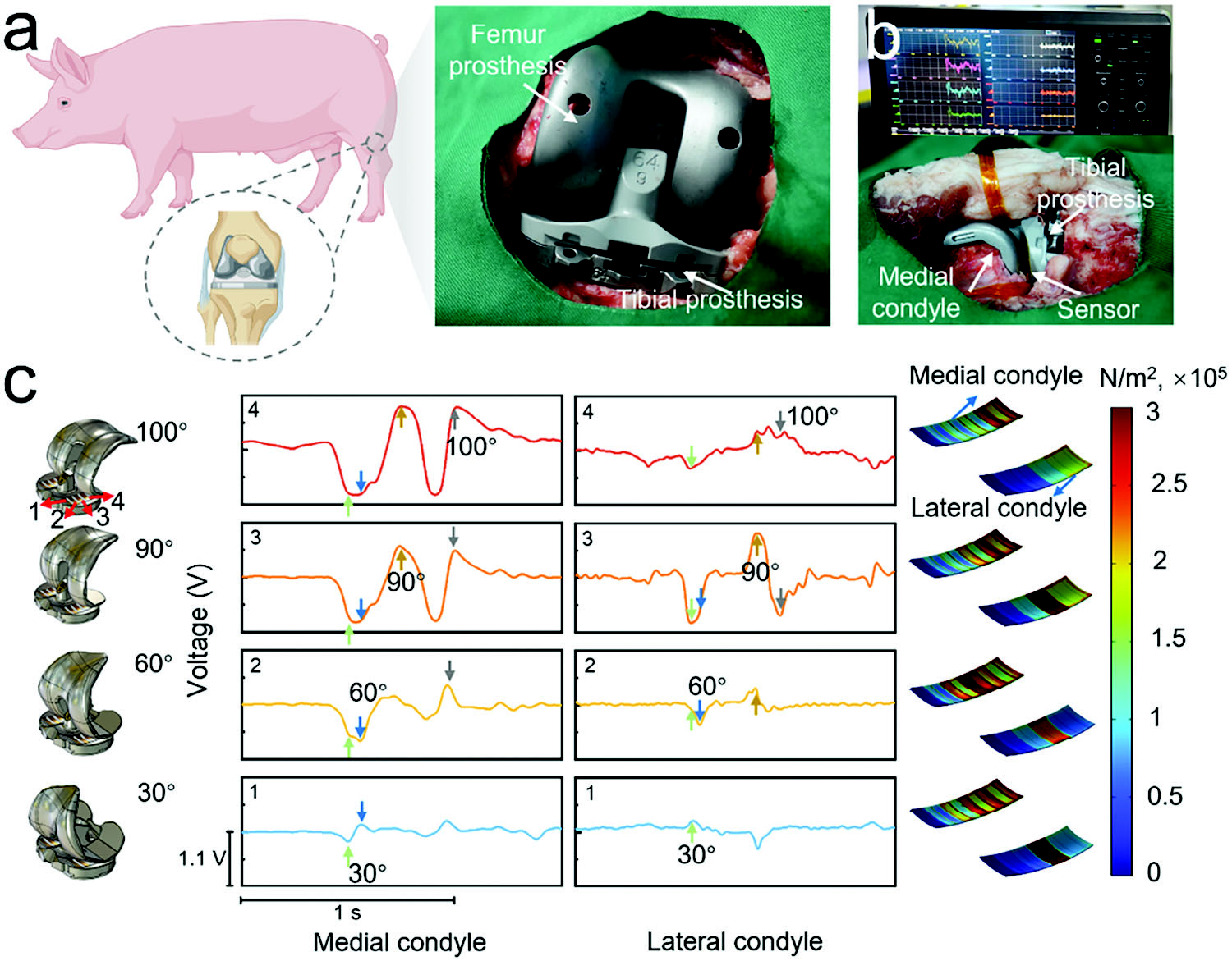 吴钰祥教授团队基于微腔结构,开发了一种全封装、长期稳定、灵活和自供电的传感阵列。该传感阵列具有响应时间快、灵敏度高、检出限低、稳定性好、抗串行干扰能力强等特点,在监测人体运动压力变化等领域具有潜力,并可以在全膝关节置换术期间,对膝关节压力作出准确评估。
