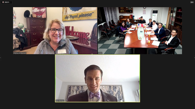 10月18日,美国海波特大学中国事务副校长施君一行来校访问,当晚21时与该校国际事务副校长克尔·拉姆塞三世、传媒学院院长弗吉尼亚·麦克德莫特举行线上视频工作会,就两校国际交流与合作事宜举行会谈。副校长李卫东及国际处、教育学院相关负责人参加会议。