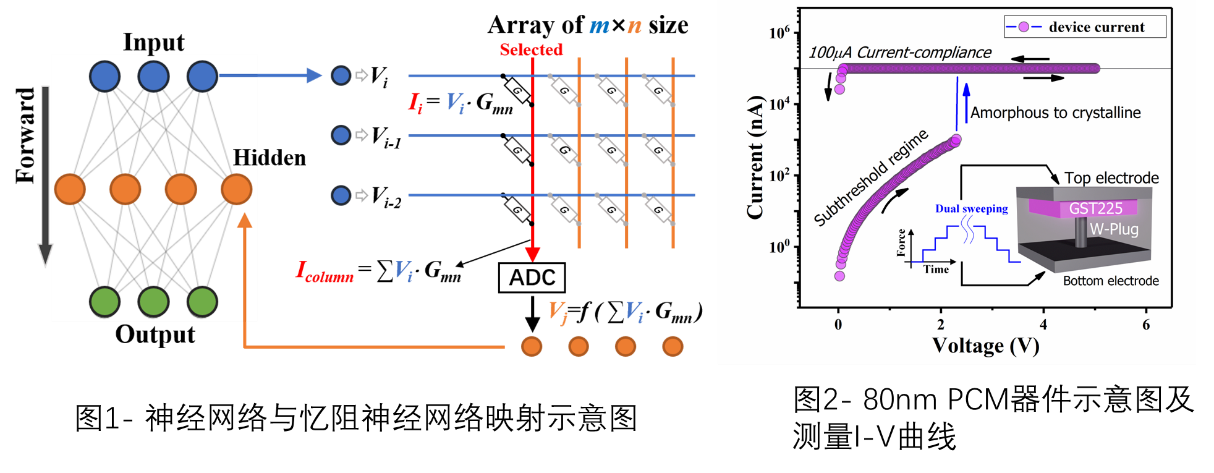 该研究工作创新地利用相变存储器(Phased-changed memory, PCM)自身的电学特性构造了全模拟域双曲正切激活函数。研究结果显示,相比常规的CMOS技术实现激活函数,基于PCM构造的激活函数准确性更高,且可与基于PCM的忆阻神经网络直接集成。该研究成果为高性能的存内计算芯片架构提供了新思路。